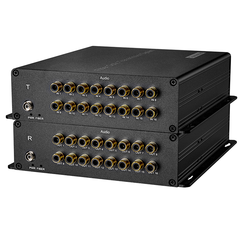 It can extend 16 Unbalanced RCA Audio over an optical fiber cable to far end. It allows 16 audio device synchronous transmission, No Step up required. 16 RCA Audio signal is transmitted from T (TX) in the direction of R (RX).