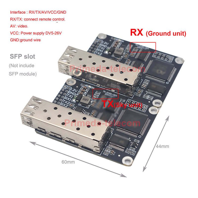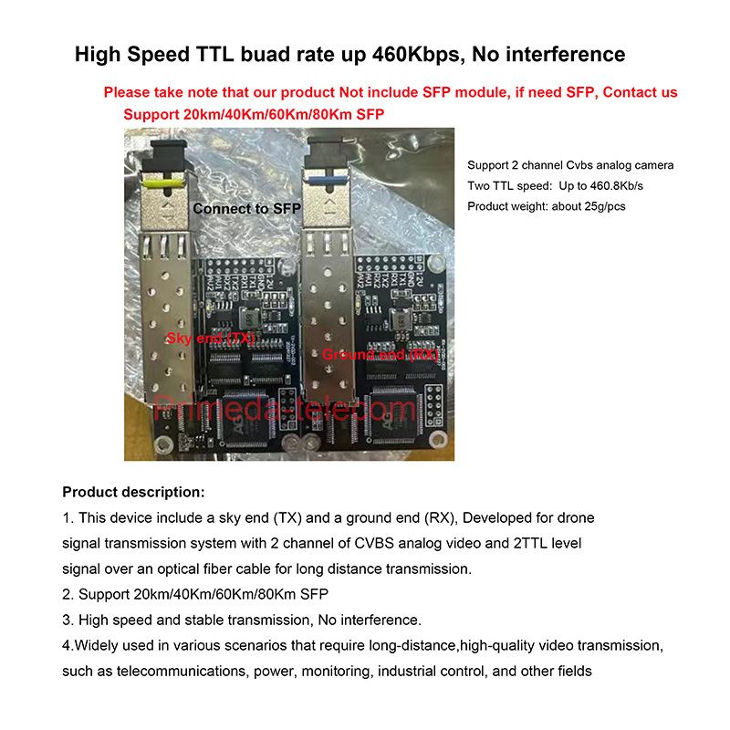 This device include a sky end (TX) and a ground end (RX), Developed for drone signal transmission system with 2 channel of CVBS analog video and 2TTL level signal over an optical fiber cable for long distance transmission.
