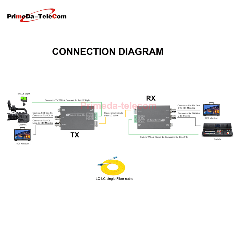This sdi over fiber device to transmit 1-channel of forward directional 3G-SDI (from TX to RX) video signal, 1-channel reverse directional RS485 data (from RX to TXX) signal and 2-channel reverse directional tally function (one red light and one green light) with lossless, delay-free transmission of up to 20 km through a single optical fibre. The device has a wide voltage power supply design of 5–30 V and provides two power supply modes: DC 5.5*2.1 and a USB Type-C interface. This makes it more flexible and convenient for use in various scenarios.